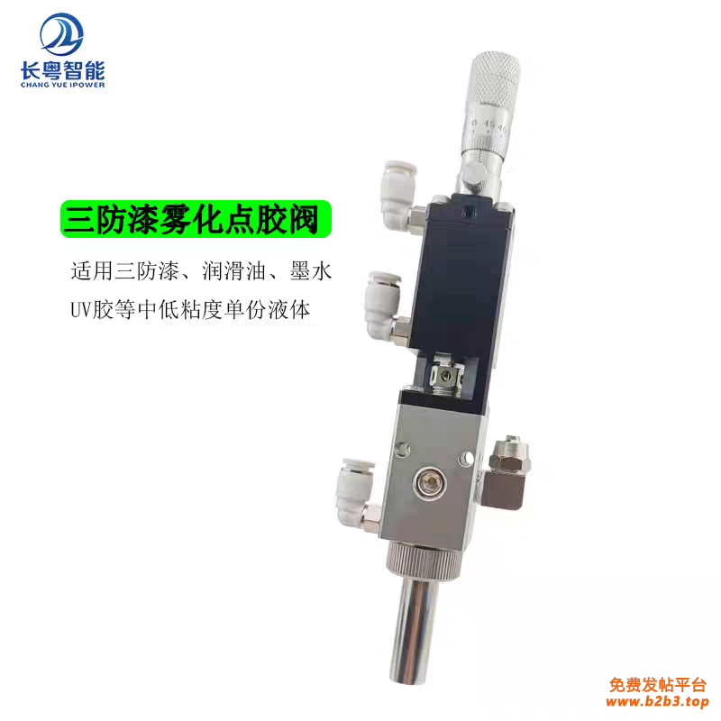 CY3610精密中雾型喷雾阀门是一款用于中低粘度溶剂型液体的雾化喷涂阀,以圆锥形方雾化形式进行喷涂,适应多种液态流体物,如丙烯酸,三防漆,硅胶,环氧,UV胶,酒精,清洗液,油漆,油墨,白乳胶等表面涂覆材料。喷涂产品无飞溅,边缘整齐。突出式固定喷嘴设计,完全做到零残留,易清洗,易调节。